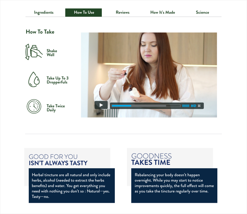 I also redesigned the additional product page tabs, incorporating graphic elements to add visual interest throughout the site experience. The homepage dropdown navigation and top banner received a clean, minimal redesign.